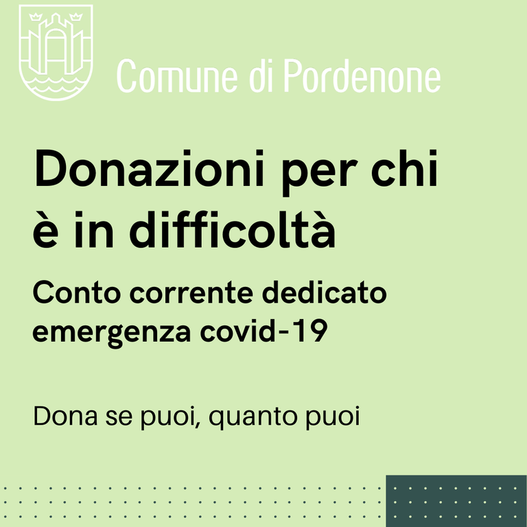 Un conto corrente per chi vuole effettuare donazioni a persone e famiglie in difficoltà residenti a Pordenone. Lo ha aperto il Comune su iniziativa del sindaco Alessandro Ciriani nell'ambito delle iniziative sociali ed economiche per l'emergenza covid-19.